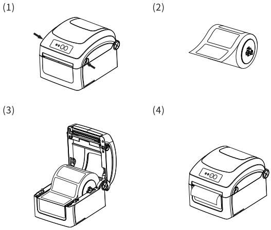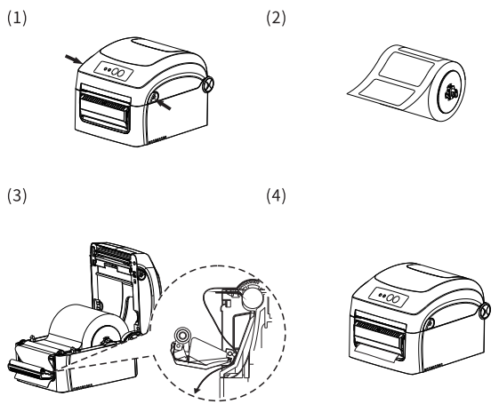 ② 将纸卷装入标签供应轴并使用纸卷固定片将纸卷固定于供应轴中央,将纸卷正放置在纸卷架上。(如果使用的较宽 的纸卷,可以将固定片取下,直接用纸卷轴即可。)